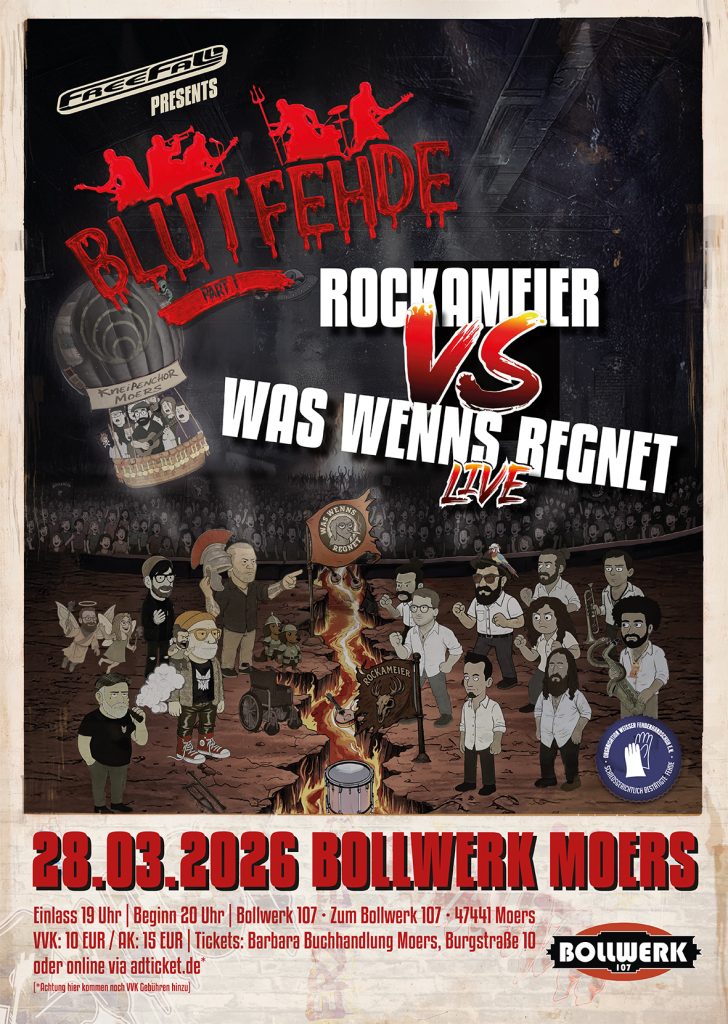 Jahrelange Harmonie und Freundschaft? Pfffft. Vergangenheit. Rockameier, Was Wenns Regnet und der Kneipenchor Moers haben auf dem letzten Freefall ihre Liebe an der gemeinsamen Feindschaft entdeckt und machen ihren Boomer-Beef jetzt offiziell. Geklärt wir alles klassisch auf der Blutwiese am “Bollwerk 107”. Am 28.03.2026 gehen die Kontrahenten gemeinsam auf die Bühne und tragen ihre Fehde musikalisch aus. Wer kapituliert als Erstes und wirft das Handtuch ins Publikum?Eine Kooperation mit dem Freefall Festival Moers.