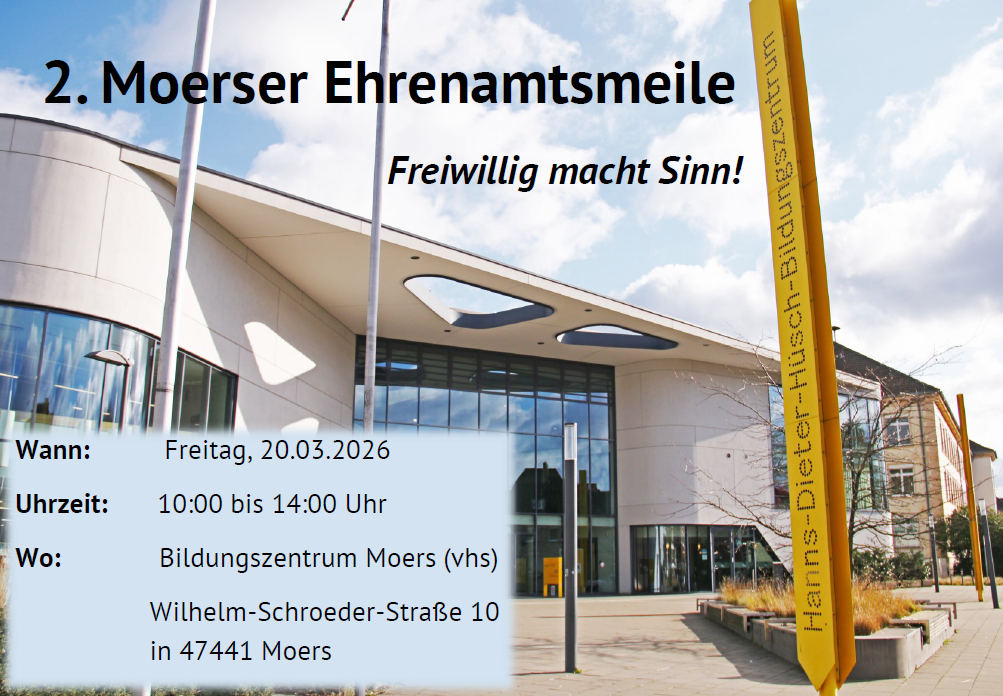 Freiwillig mitmachen lohnt sich!Möchten Sie sich ehrenamtlich engagieren? Sie fragen sich:Wo kann ich helfen?Wie nehme ich Kontakt auf?Brauche ich besondere Kenntnisse?Rund um das Thema Ehrenamt gibt es viele Fragen. Antworten darauf gibt die Moerser Ehrenamtsmeile.Was erwartet Sie?Auf der Ehrenamtsmeile können sich alle Bürgerinnen und Bürger informieren über:ehrenamtliche Tätigkeitenverschiedene Organisationen und Vereinekonkrete Möglichkeiten zum Mitmachenrelevante InformationenSie erfahren:wie der Einstieg ins Ehrenamt gelingtwelche Aufgaben es gibtwieviel Zeit man investieren kannFür jedes Alter und jede Lebenssituation gibt es passende Angebote. Wer organisiert die Ehrenamtsmeile?Die Ehrenamtsmeile wird organisiert von:der Leitstelle Älterwerden der Stadt Moersder Freiwilligenzentrale Moers der Grafschafter Diakonie Diakonisches Werk Kirchenkreis Moers Wer stellt sich vor?Begegnungszentrum des AWO Kreisverband Wesel e.V. aus Asberg und RepelenBegegnungszentrum der Evangelische Kirchengemeinde Moers-ScherpenbergInterkulturelles Nachbarschaftsnetzwerk 55plus Meerbeck der Evangelische Kirchengemeinde Moers-MeerbeckSeniorenbüro Repelen der Grafschafter Diakonie gGmbH - Diakonisches Werk Kirchenkreis MoersSelbsthilfe- Kontaktstelle Kreis Wesel und Kontaktbüro Pflegeselbsthilfe Kreis Wesel des Paritätischen NRWNABU Ortsgruppe Moers / Neukirchen-Vluyn des NABU Kreisverband Wesel e.V.Palette 2.0 Repelen der evangelischen und katholischen Kirchengemeinde, des Caritasverbandes Moers-Xanten e.V. und der Diakonie Grafschafter Diakonie gGmbH- Diakonisches Werk Kirchenkreis MoersWeltladen in Moers und fair niederrhein des Vereins zur Förderung des fairen Handel(n)s am NiederrheinBetreuungsstelle der Stadt MoersArbeitsgemeinschaft Moers Deutsche Rheuma-Liga-NRWBürgerbus Moers-Süd e.V.AWO Seniorenzentrum Moers Paul-Saatkamp-Haus der AWO Seniorendienste NiederrheinUnser ZielWir möchten das ehrenamtliche Engagement in Moers stärken. Ehrenamt bedeutet:helfenGemeinschaft erlebenetwas Sinnvolles tunKommen Sie vorbei – wir freuen uns auf Sie!Bei Rückfragen wenden Sie sich an die Leitstelle Älterwerden der Stadt Moers unter 0 28 41 / 201-609 oder per E-Mail [email protected]. Melden Sie sich gerne über die vhs zu den Workshops an: Kurs-Nr.: H10250B: Anmeldung bei der vhs -> Wissenswerte Informationen über das EhrenamtKurs-Nr.: H10250A: Anmeldung bei der vhs -> Informationen zur App"Gut versorgt in Moers“Kurs-Nr.: H10250C: Anmeldung bei der vhs -> Plauderbank - Gesprächsorte gegen EinsamkeitKurs-Nr.: H10250D: Anmeldung bei der vhs -> Ruhestand - Zeit für NeuesKurs-Nr.: H10250E: Anmeldung bei der vhs -> Heldencheck