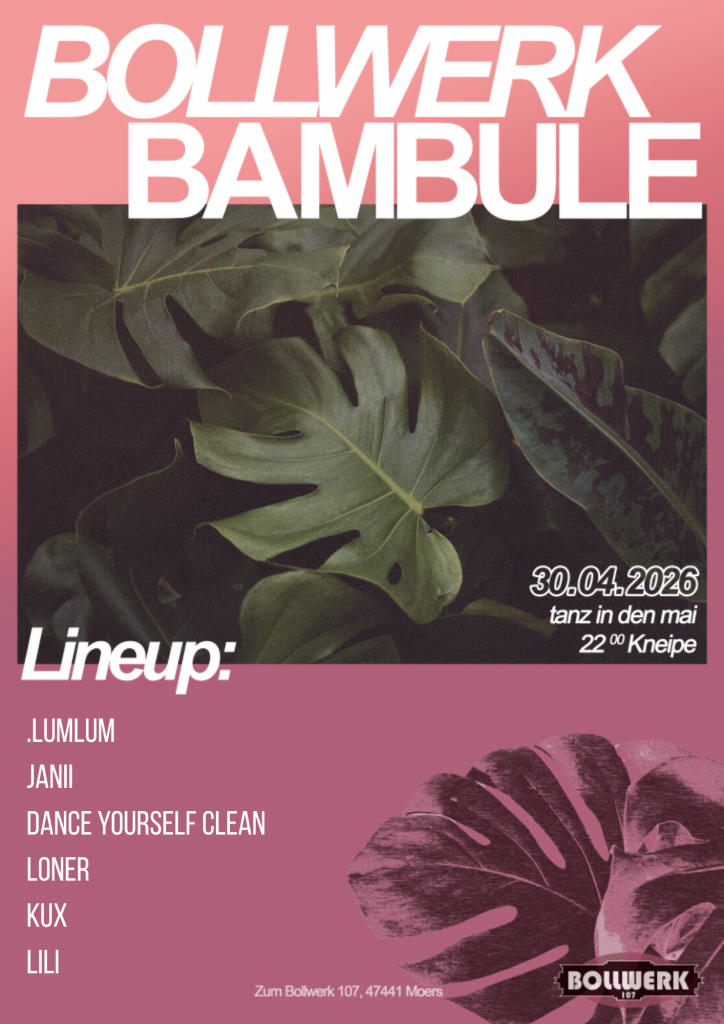 Wir freuen uns die erste Bambule diesen Jahres passend zum Tanz in den Mai raushauen zu können. Zudem ist dieses Mal tatkräftiger SoundSupport des Kollektivs ProjectDuisburg am Start. Zusammen liefern wir euch feinste Musik von House bis Techno, damit man so richtig fröhlich in den Mai dancen kann.Freut euch auf einen überragenden Abend …Line Up:.lumlumJaniiDance Yourself CleanLonerKuxLiliDer Eintritt ist frei, also kommt vorbei!