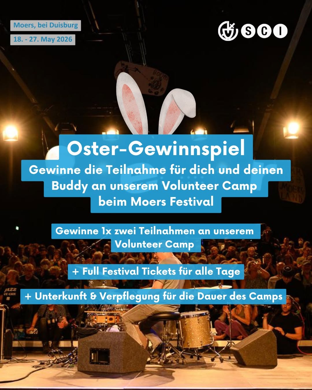 Oster-Gewinnspiel: Ab ins Volunteer Camp beim Moers Festival 🐇 Statt Schokohasen gibt’s dieses Jahr etwas wirklich Besonderes zu Ostern: Wir verlosen 1x zwei kostenlose Teilnahmen für dich und deinen Buddy am Volunteer Camp 55th Moers Music Festival 2026 inkl. Full Festival Ticket sowie Unterkunft und Verpflegung für die Dauer des Camps mit einzigartigen Einblicken hinter die Kulissen! 🎶 Erlebt gemeinsam: • ein internationales non-mainstream Musikfestival • spannende Tage voller Konzerte, Diskussionen und Teamwork • Front- und Backstage-Erlebnisse: von Aufbau und Deko über Einlass, Backstage-Support, Kinderbetreuung und Merch bis hin zu Begegnungen mit Künstler*innen, Crew und internationaler Presse 🎷 So machst du mit: • diesen Beitrag liken • unserem Profil folgen • in den Kommentaren die Person taggen, mit der du das Volunteer Camp erleben möchtest • teile diesen Beitrag in deiner Story und sende uns einen Screenshot davon, um die Gewinnchance zu erhöhen Am 07.04.2026 losen wir aus und benachrichtigen die Gewinner*innen per DM. 📅 18. – 27.05.2026 📍 Moers 🌐 Mehr Infos zum Volunteer Camp: https://t1p.de/MoersFestival26 Teilnehmen können alle Personen ab 18 Jahren mit Wohnsitz in Deutschland. Die vollständigen Teilnahmebedingungen findest du in unserer Bio. Dieses Gewinnspiel wird auf Facebook & Instagram veröffentlicht. _____ Easter Give Away: Volunteer Camp at the Moers Festival 🐇 We’re giving away 1x two free places for you and your friend at the 55th Moers Music Festival 2026 Volunteer Camp, incl. a full festival ticket as well as accommodation and meals for the duration of the camp! 🎷 How to enter: • Like this post • Follow our profile • Tag the person you’d like to experience the volunteer camp with in the comments • Share this post in your story and send us a screenshot of it to increase your chances We’ll draw the winners on 7 April 2026 and notify them via DM. 📅 18 – 27 May 2026 📍 Moers 🌐 More info about the Volunteer Camp: https://t1p.de/MoersFestival26 Anyone aged 18 or over who is resident in Germany can take part. You can find the full terms and conditions in our bio. This competition is being run on Facebook & Instagram.
