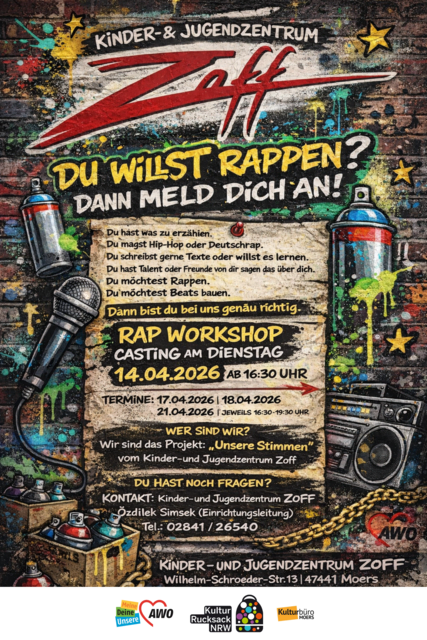 Du hast was zu erzählen, schreibst gerne Texte und magst Rap und Hip Hop? Dann bist du im Workshop des AWO Kinder und Jugendzentrums Zoff an der Wilhelm-Schroeder-Straße 13 genau richtig. Am 17., 18. und 21. April, jeweils von 16.30 bis 19.30 Uhr, ist es so weit! Vorab gibt es noch ein Casting am 14. April, ab 16.30 Uhr. Die Teilnahme ist kostenlos. Der Workshop richtet sich an Kinder und Jugendli...