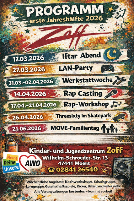 Das AWO Kinder- und Jugendzentrum „Zoff“ an der Wilhelm-Schroeder-Straße 13 in Moers-Mitte hält auch in diesem Jahr wieder zahlreiche Angebote und Projekte bereit. Im ersten Halbjahr sind dies unter anderem eine LAN-Party, ein Rap-Workshop und der „Move“ Familientag. Diese Angebote laufen zusätzlich zu den regelmäßig stattfindenden Workshops und anderen Aktionen. Alle Veranstaltungen sind kostenlo...